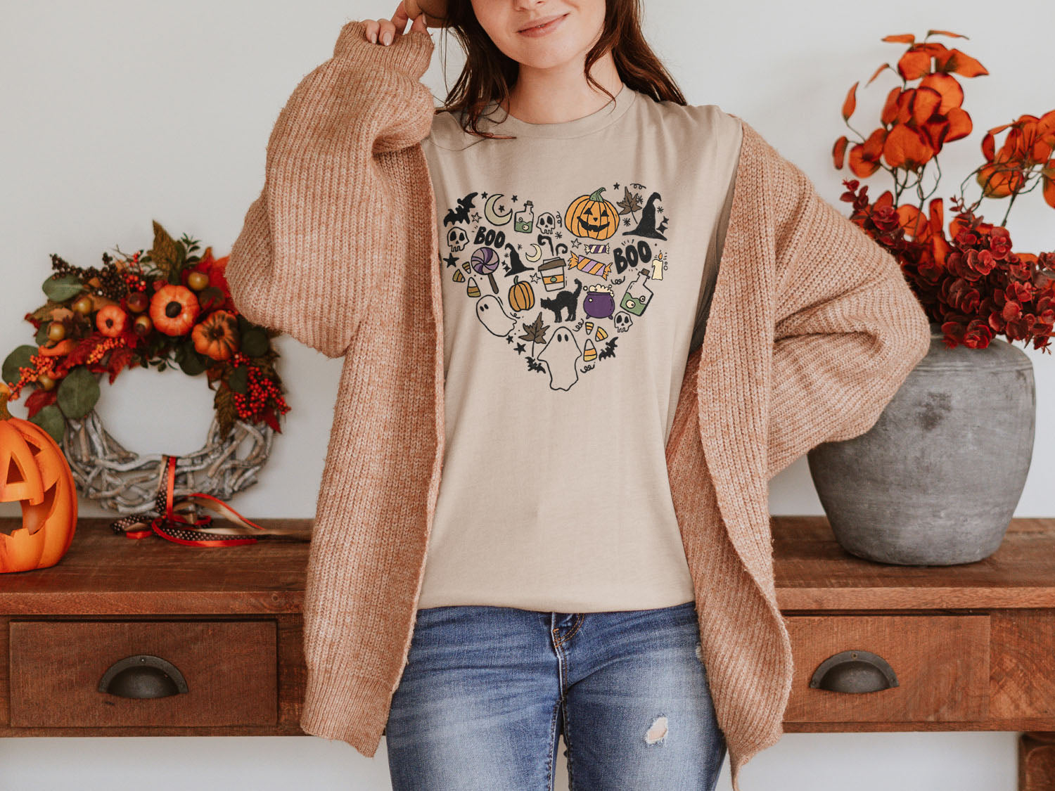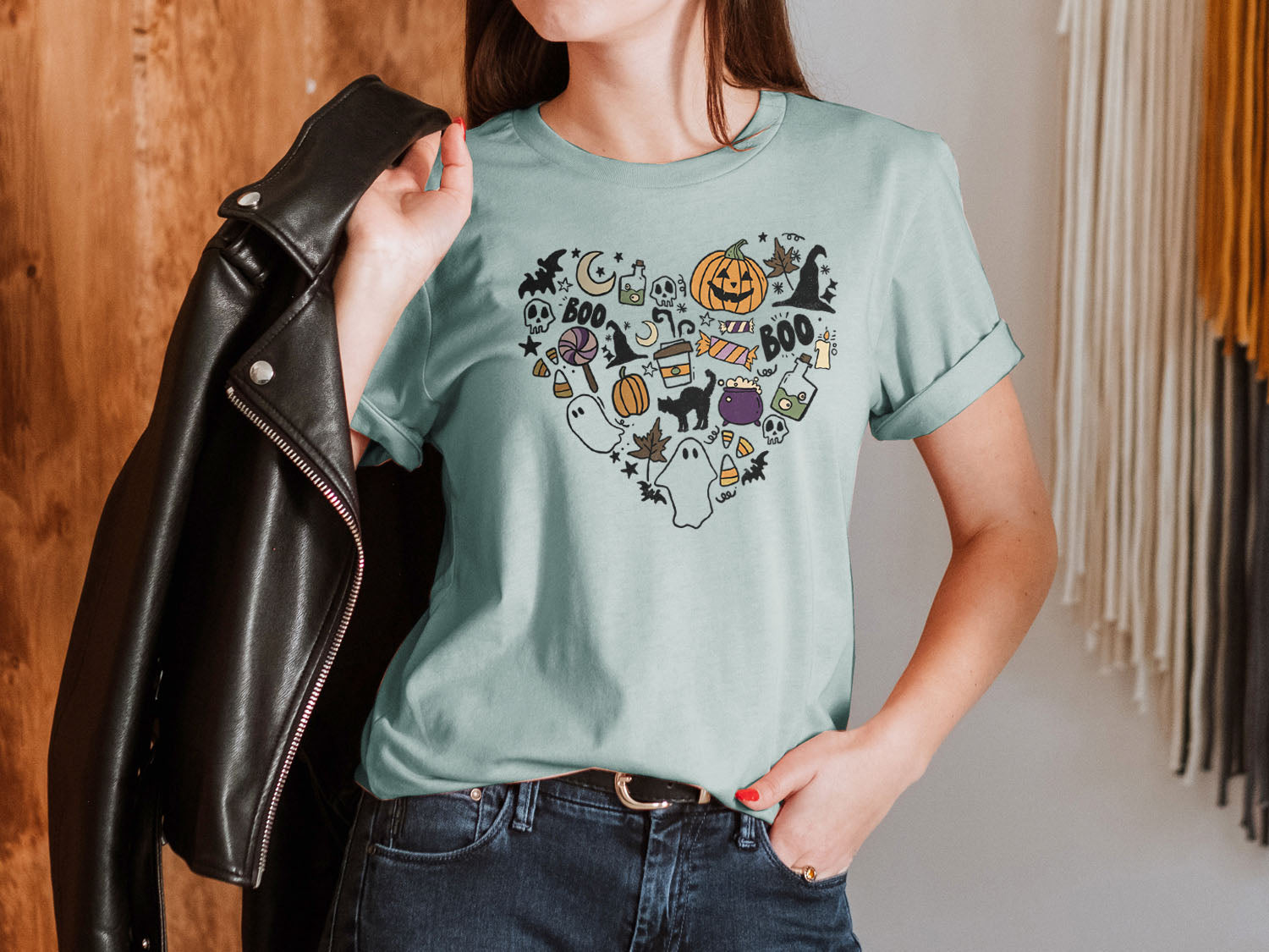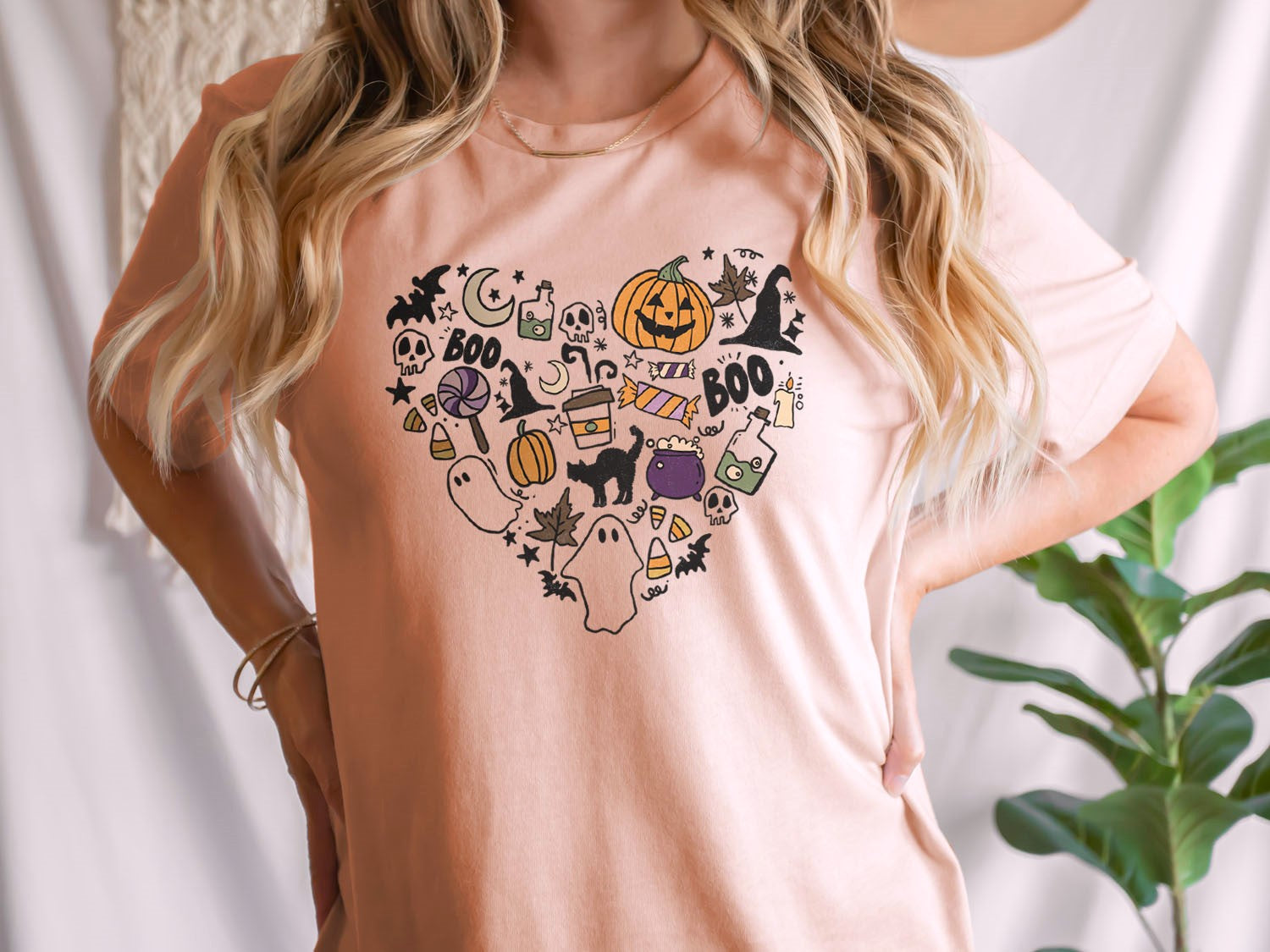 Halloween Stuffs in Heart Shape T-shirt - Halloween Ghost Pumpkin Witch Retro Vintage Design Printed Tee Shirt