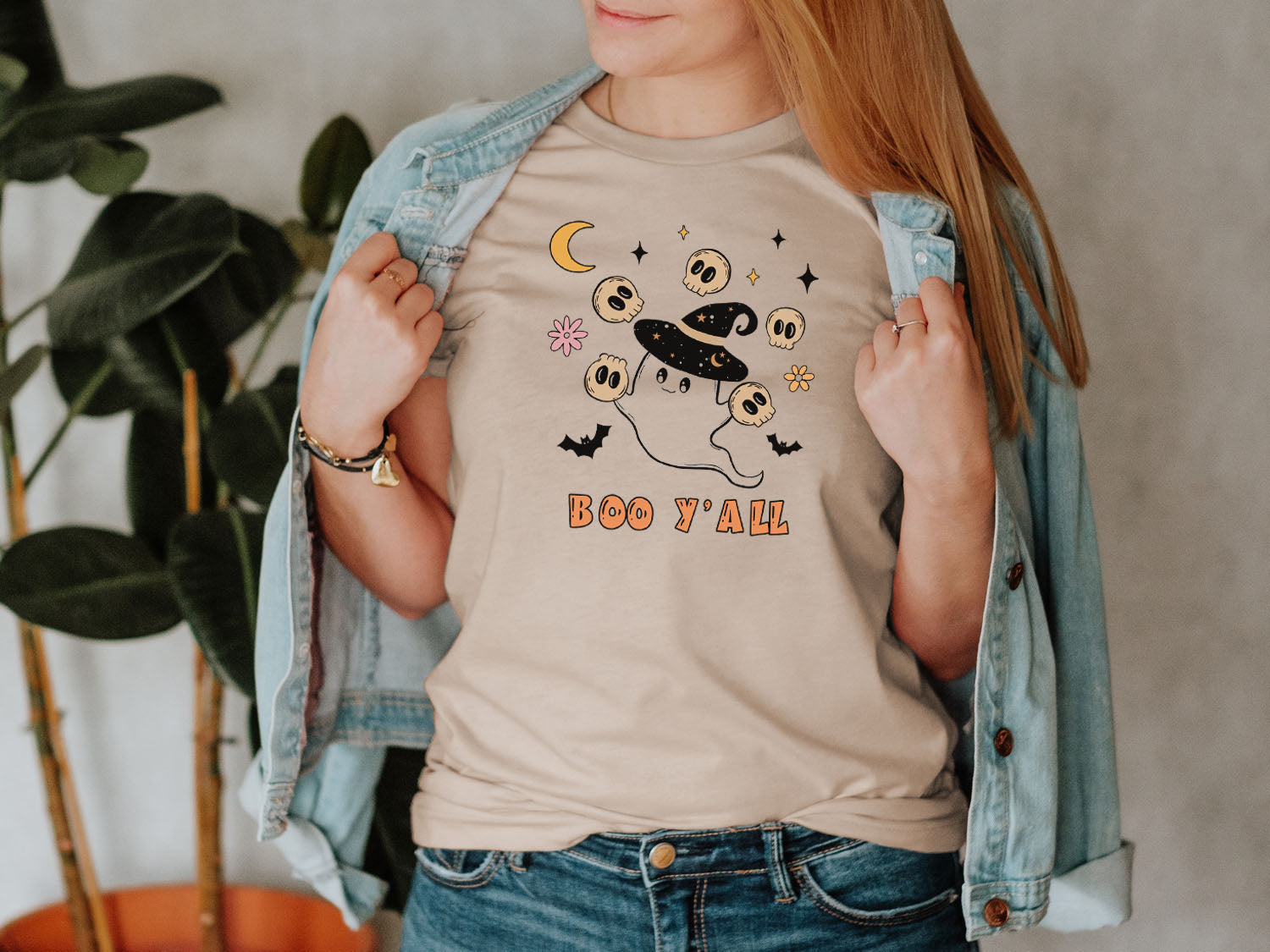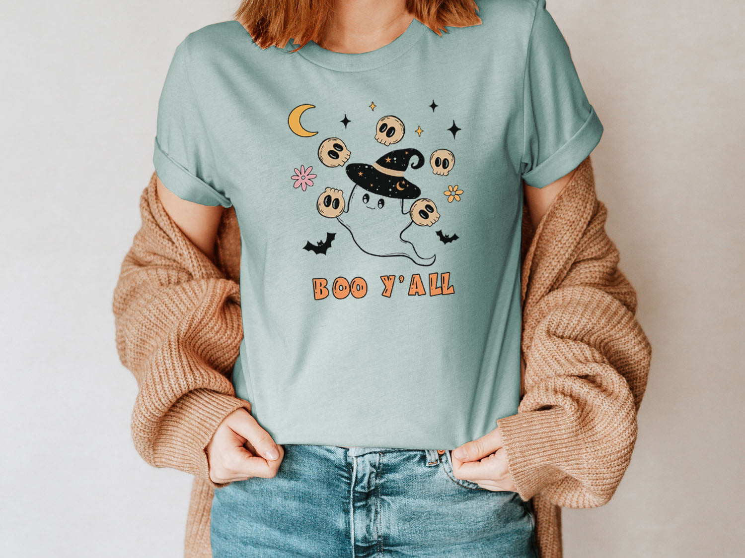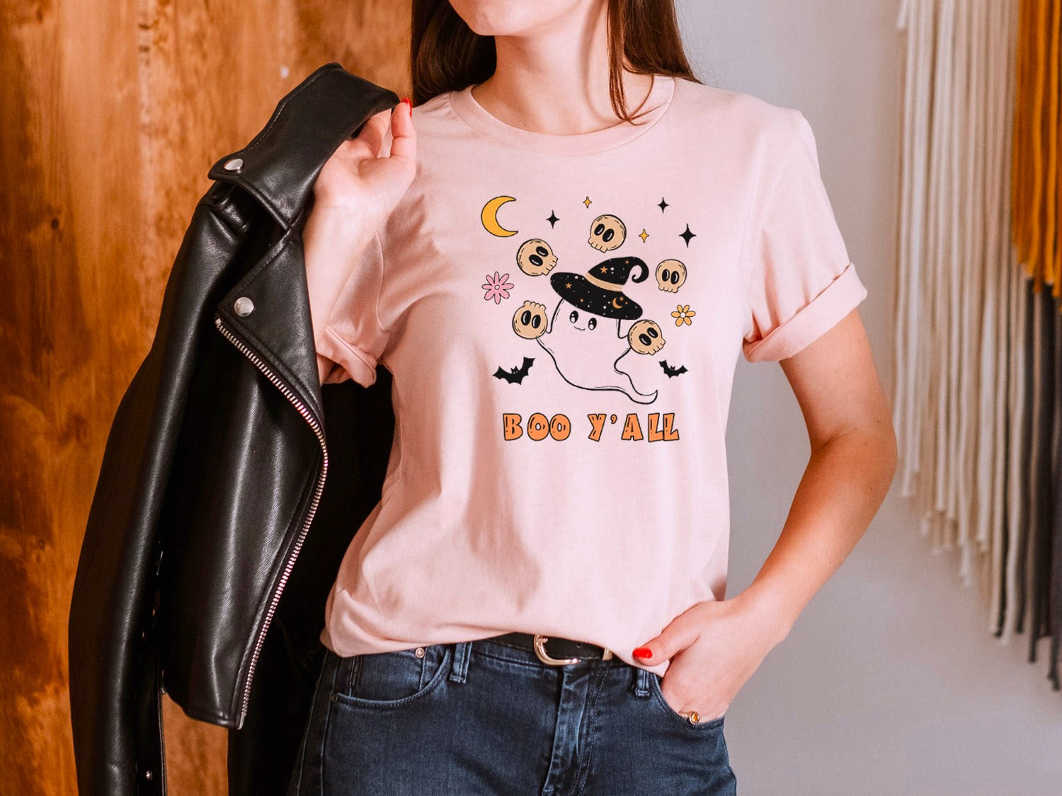 Halloween Cute Witch Ghost Boo Y'ALL T-shirt - Halloween Ghost Witch Retro Vintage Design Printed Tee Shirt