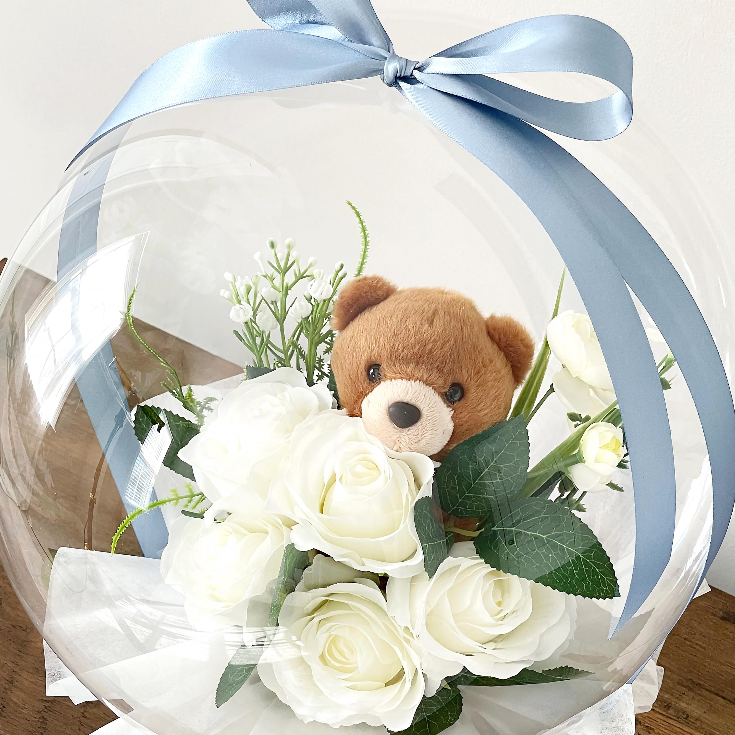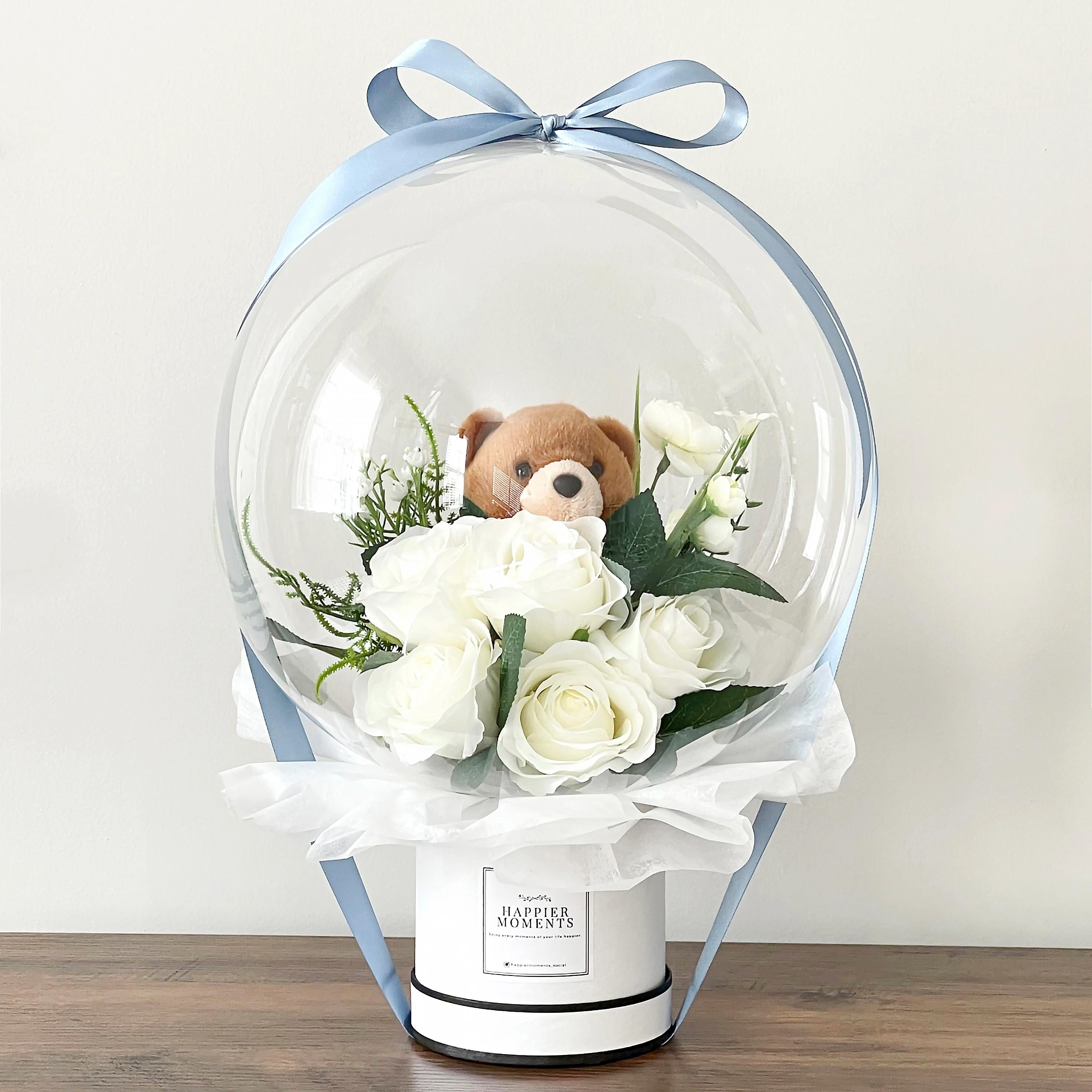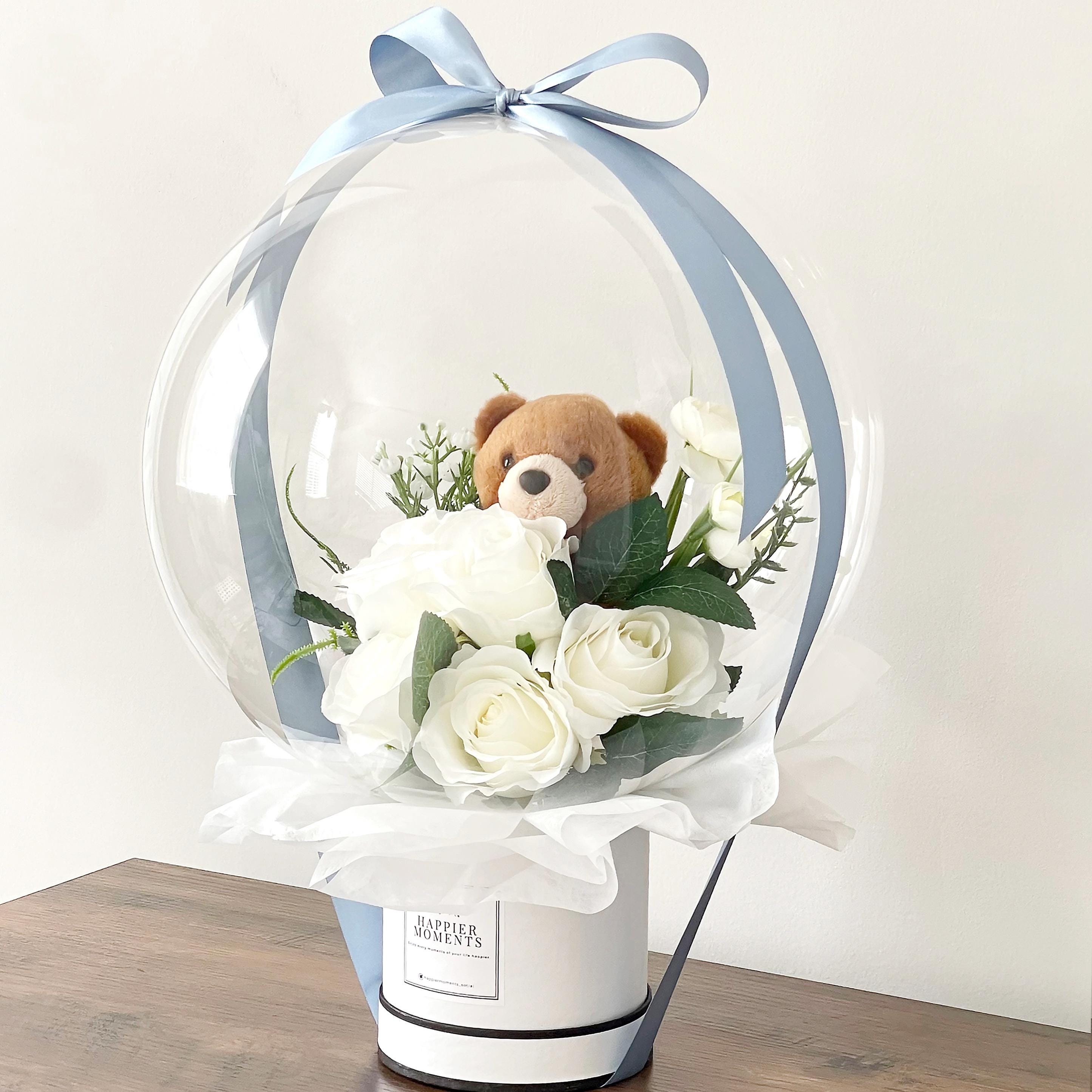 Teddy Bear White Rose Flower Bobo Balloon Bouquet White Box Blue Ribbon | Birthday Mother's Day Valentine's Day Shower Baby Shower Gift