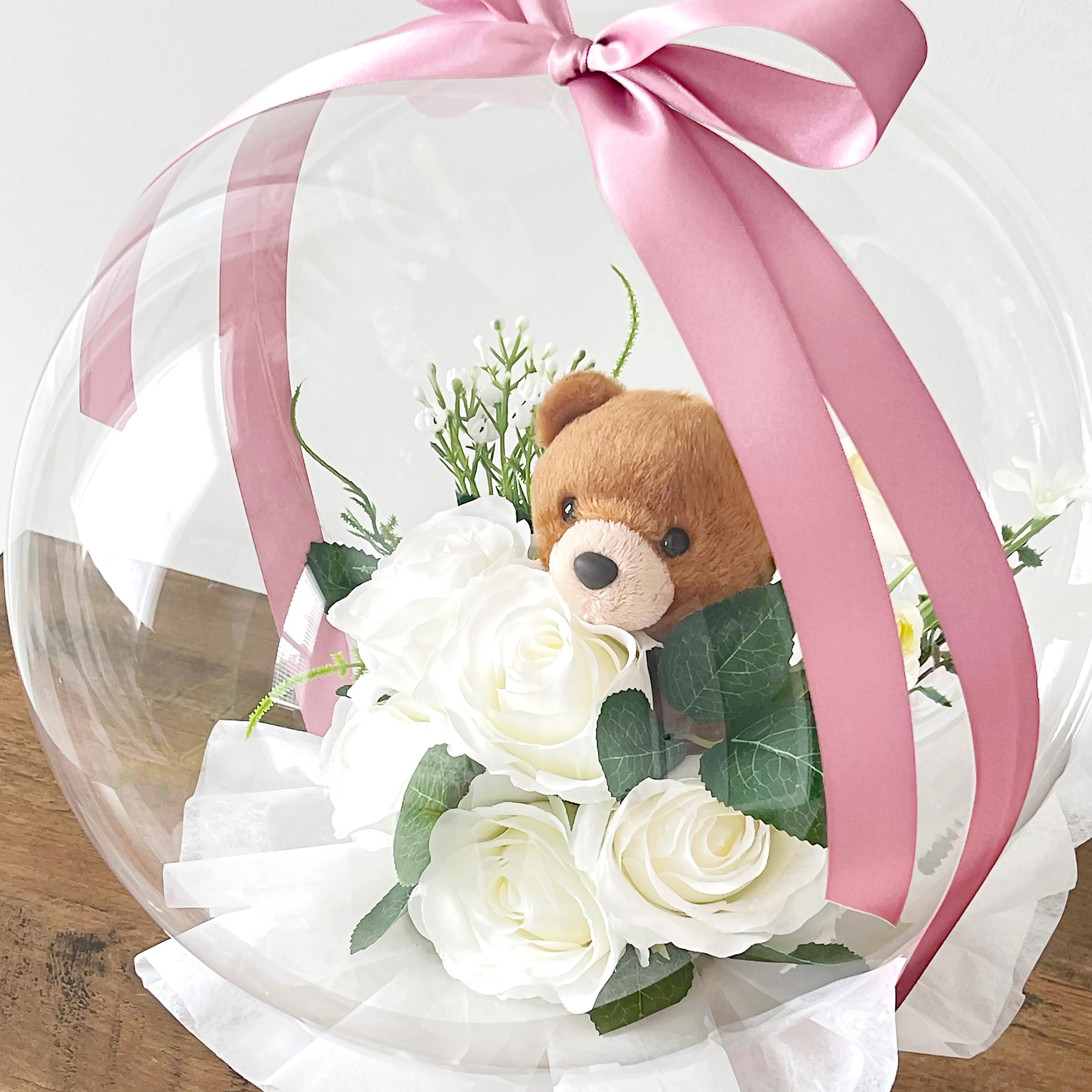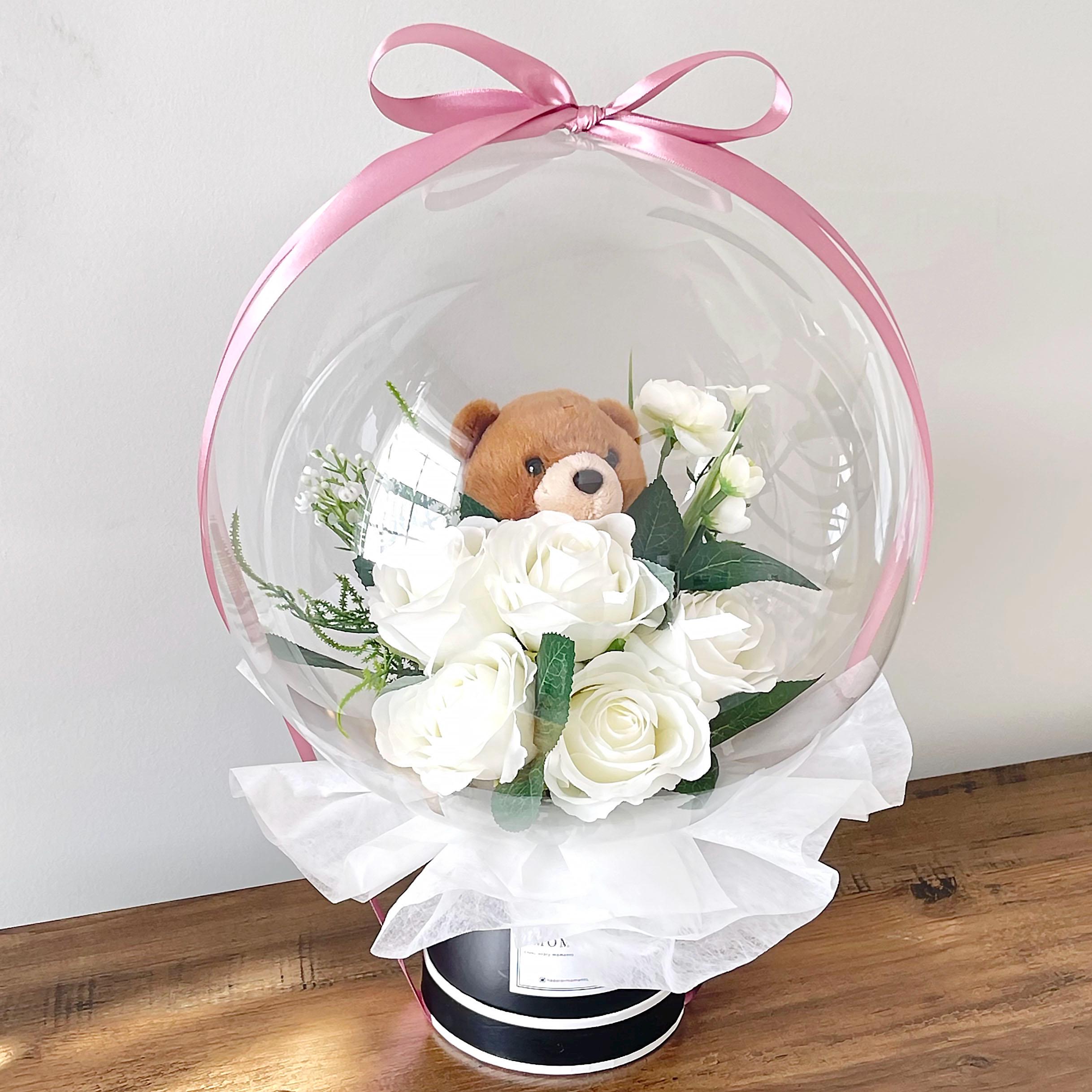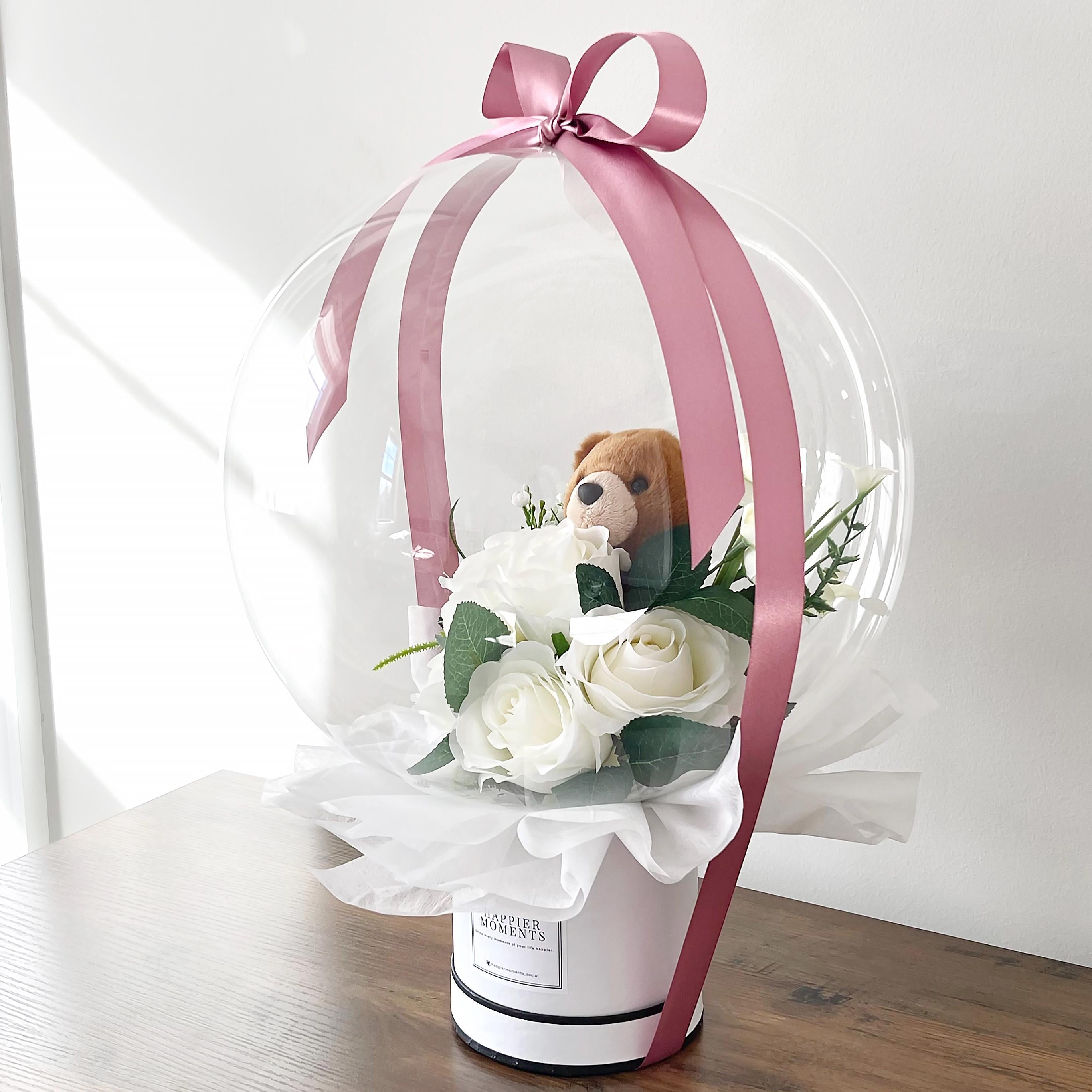 Teddy Bear White Rose Flower Bobo Balloon Bouquet White Box Pink Ribbon | Birthday Mother's Day Valentine's Day Baby Shower Gift