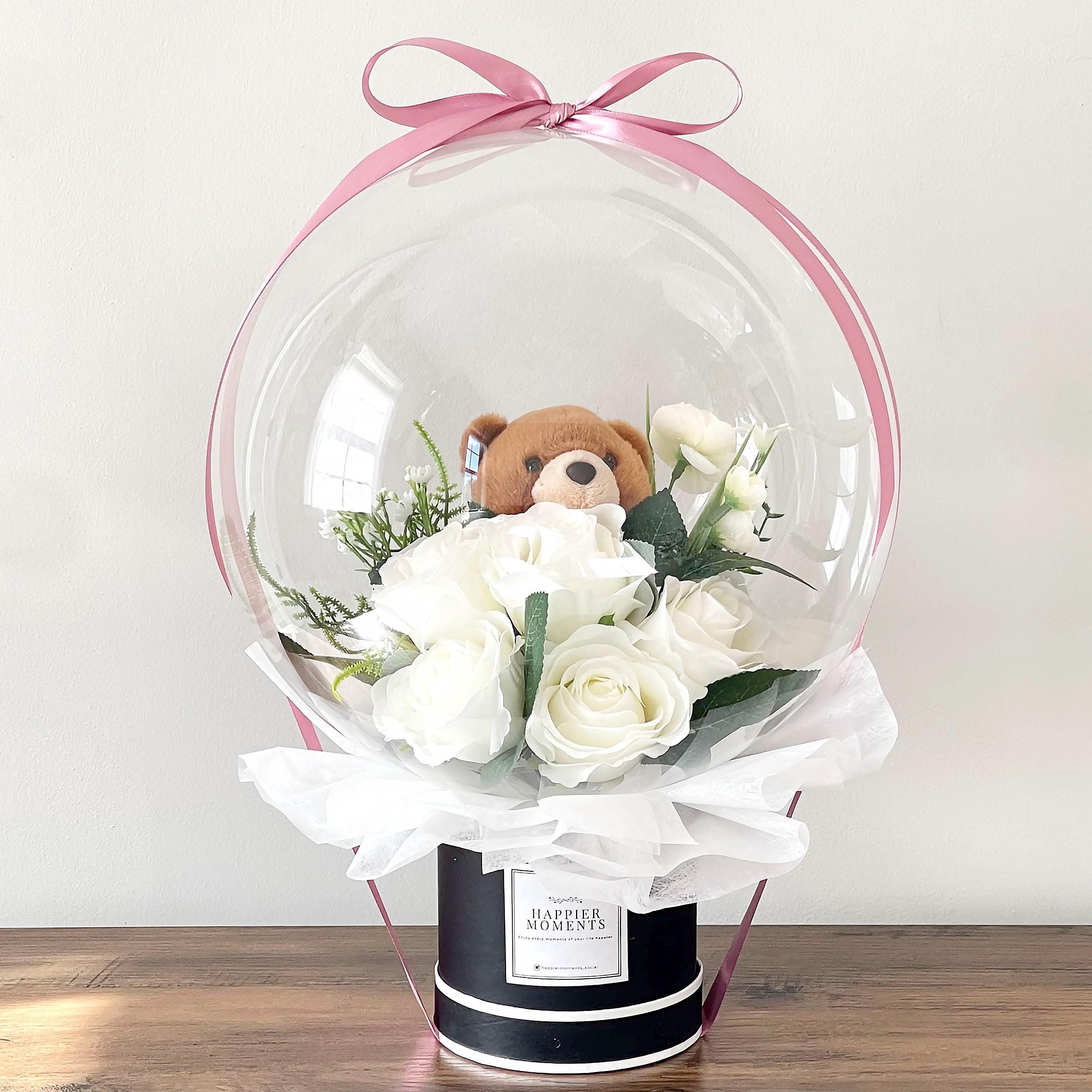 Teddy Bear White Rose Flower Bobo Balloon Bouquet Black Box Pink Ribbon | Birthday Mother's Day Valentine's Day Baby Shower Gift