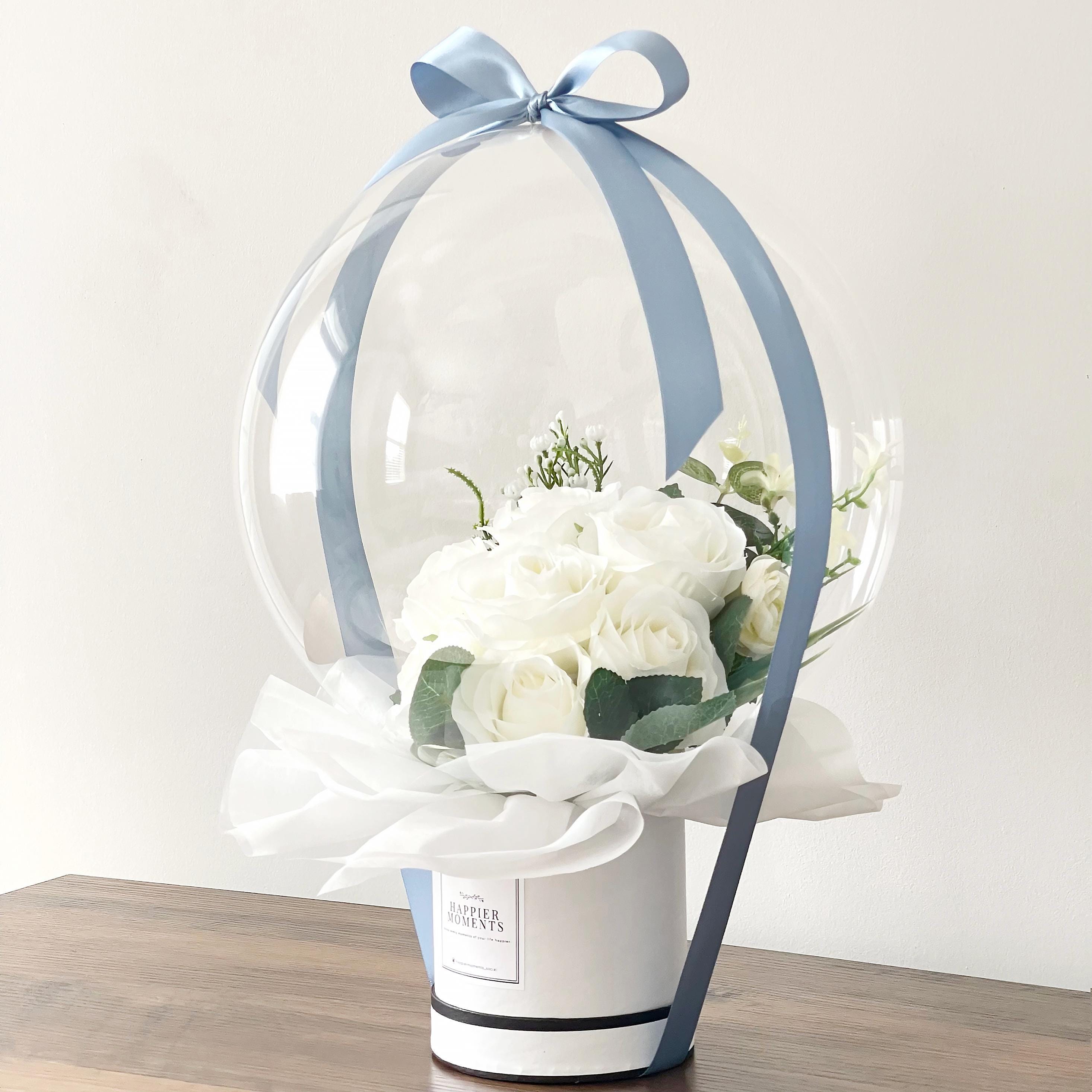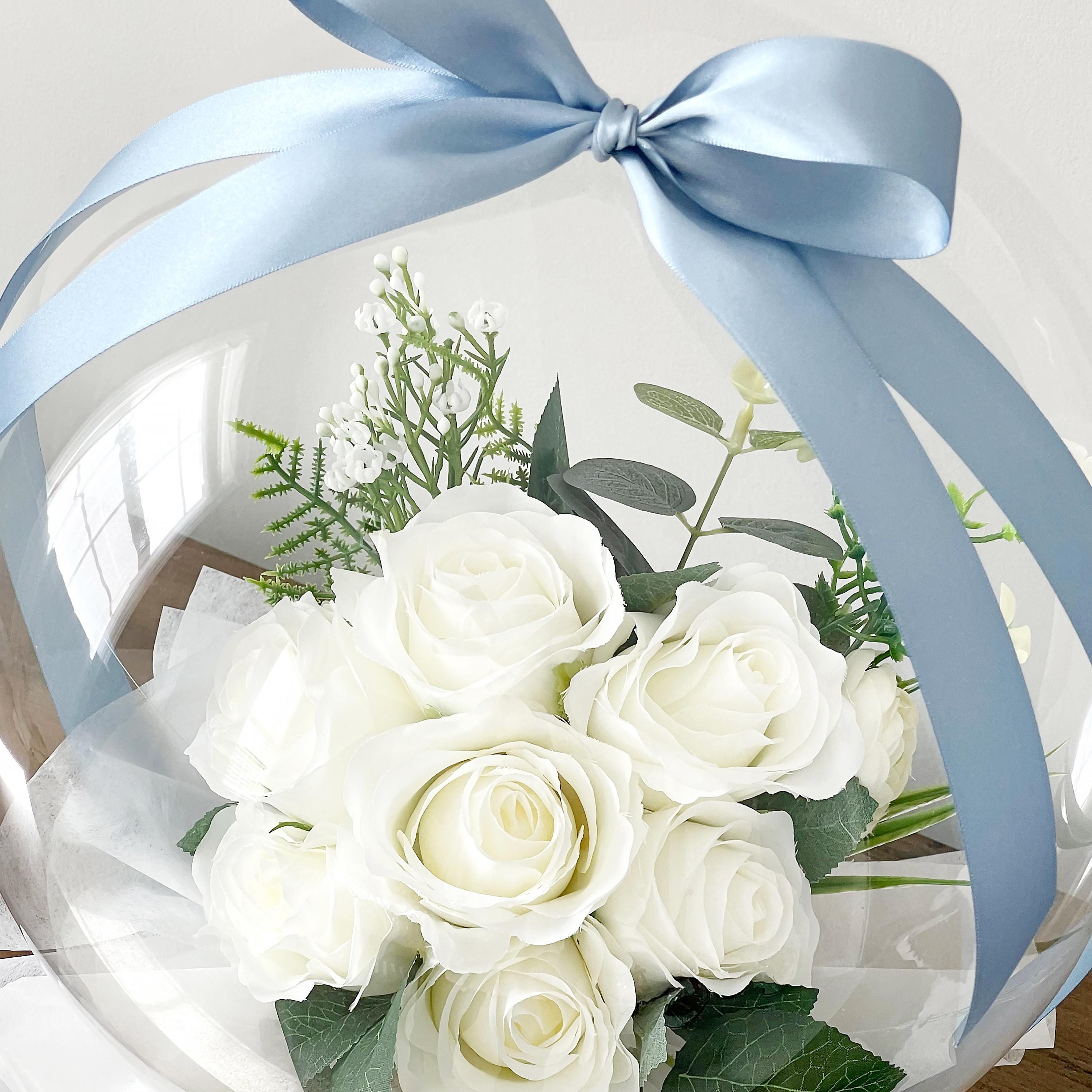 White Rose Flower Bobo Balloon Bouquet White Box Blue Ribbon | Birthday Mother's Day Valentine's Day Bridal Shower Baby Shower Gift