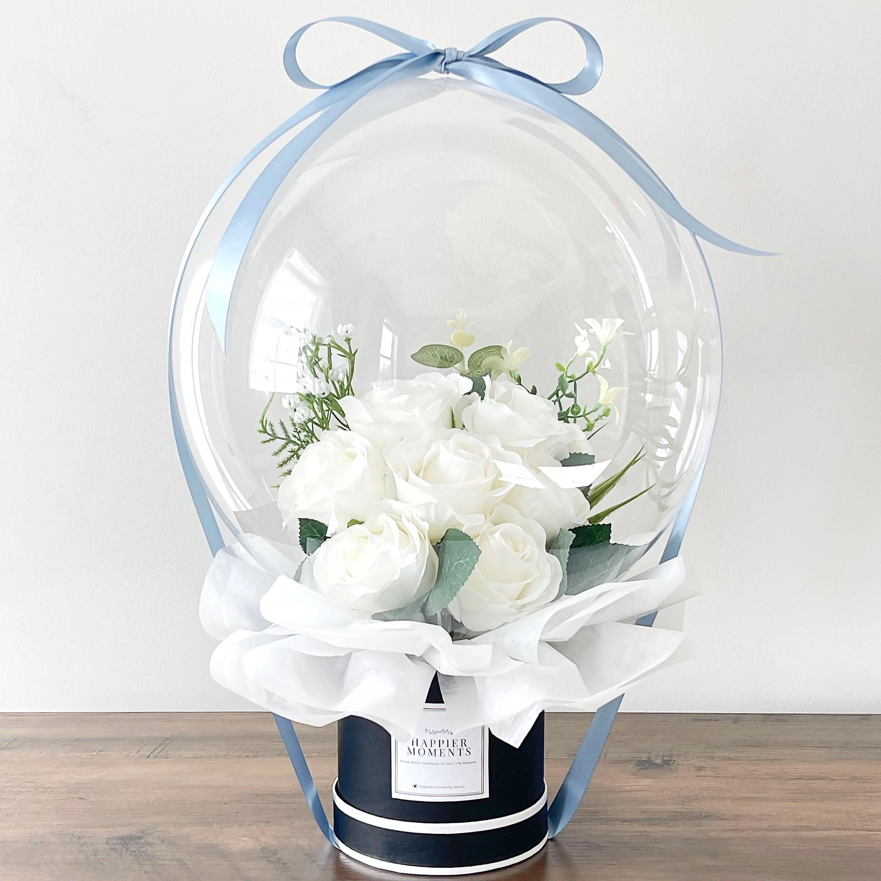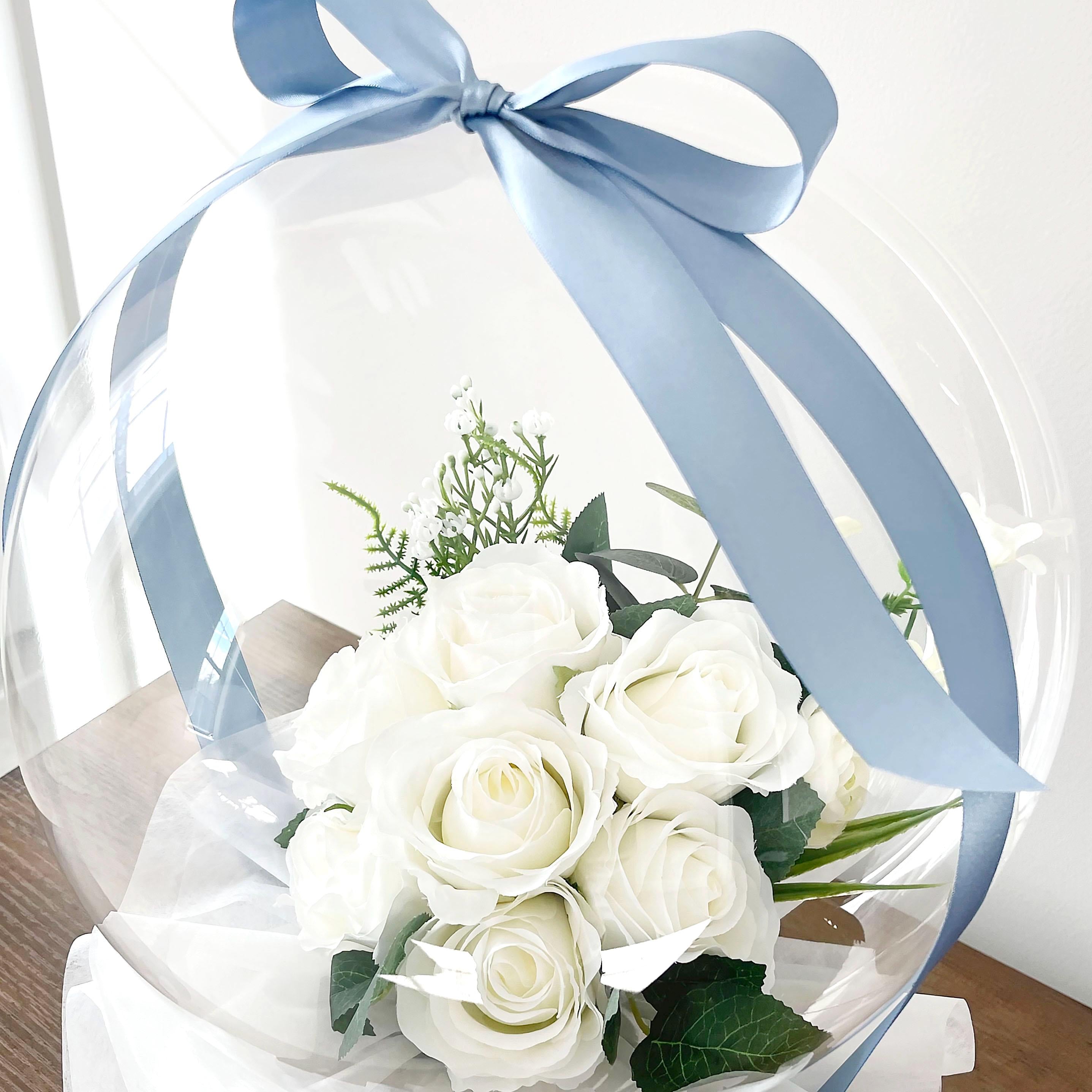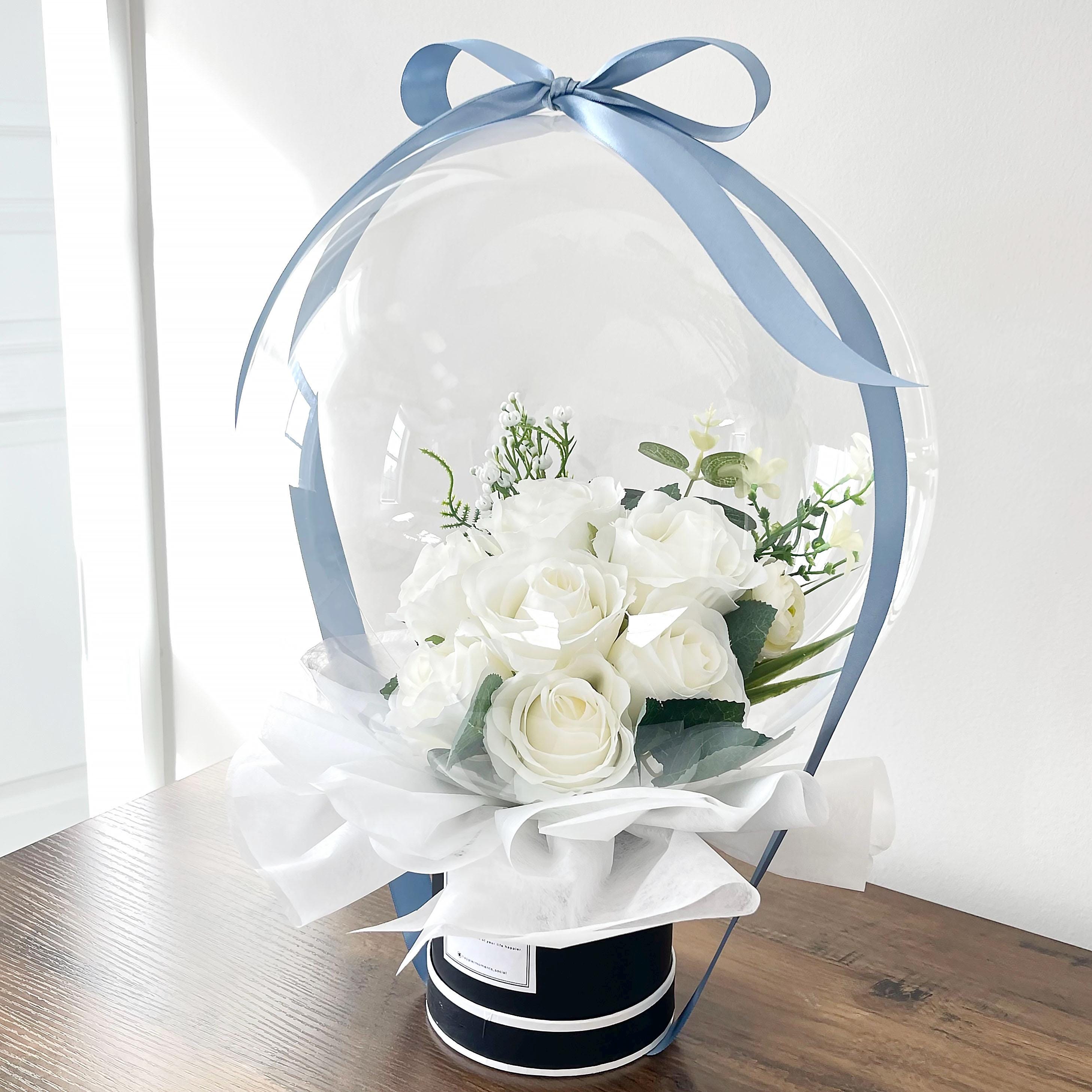 White Rose Flower Bobo Balloon Bouquet Black Box Blue Ribbon | Birthday Mother's Day Valentine's Day Bridal Shower Baby Shower Gift