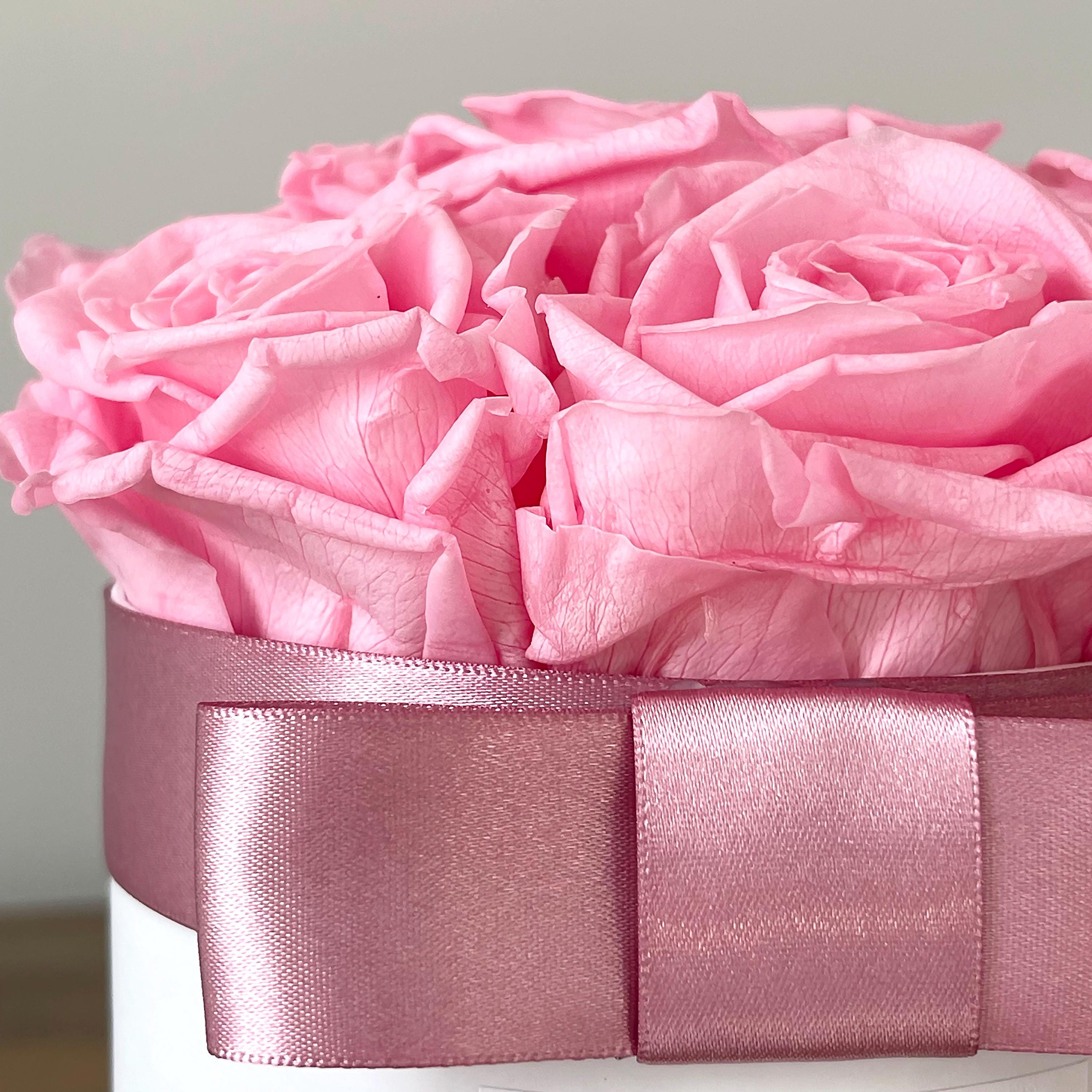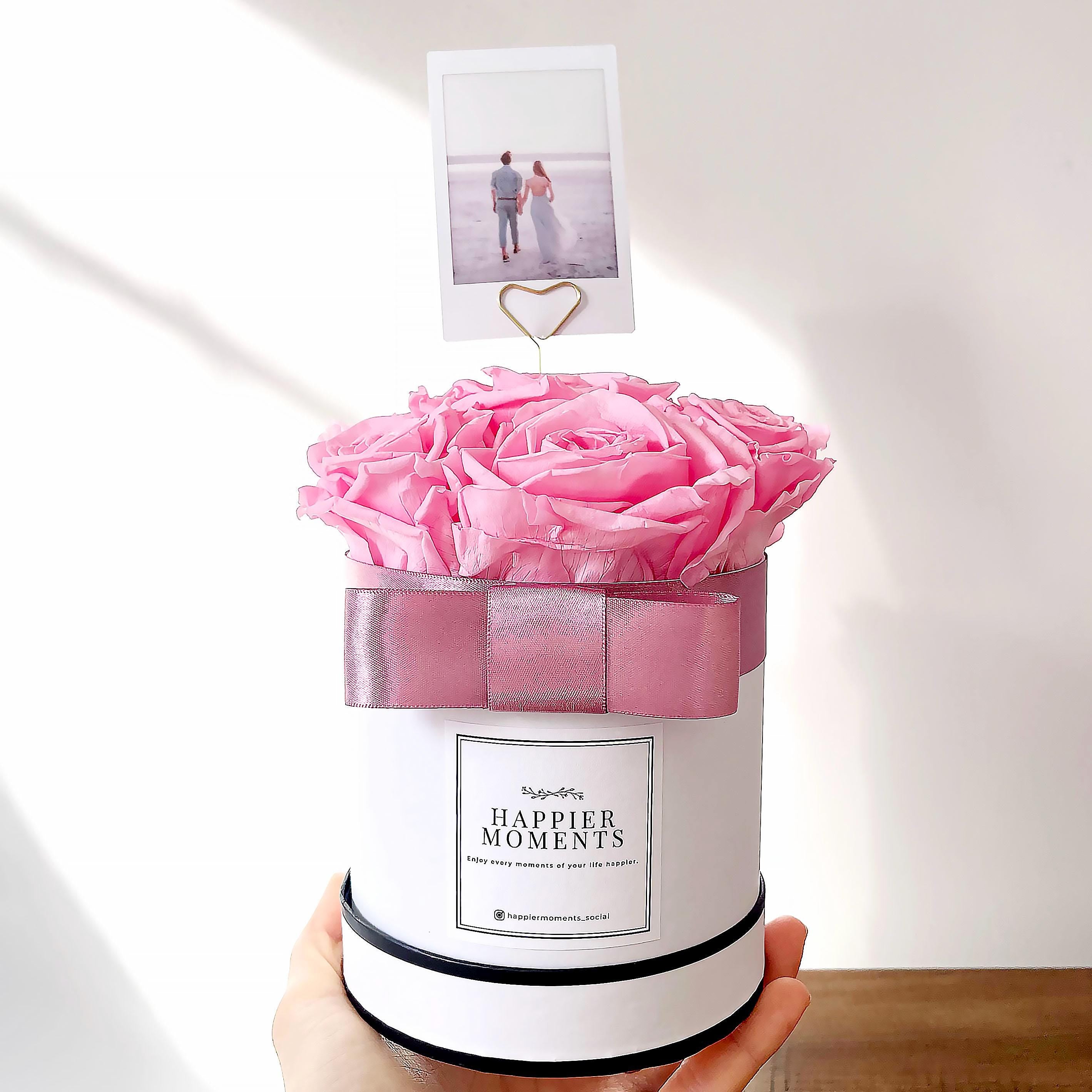 6 Pink Preserved Roses Personalized Photo White Round Gift Box | Eternity Roses Birthday Mother's Day Valentine's Day Anniversary Pregnancy Announcement