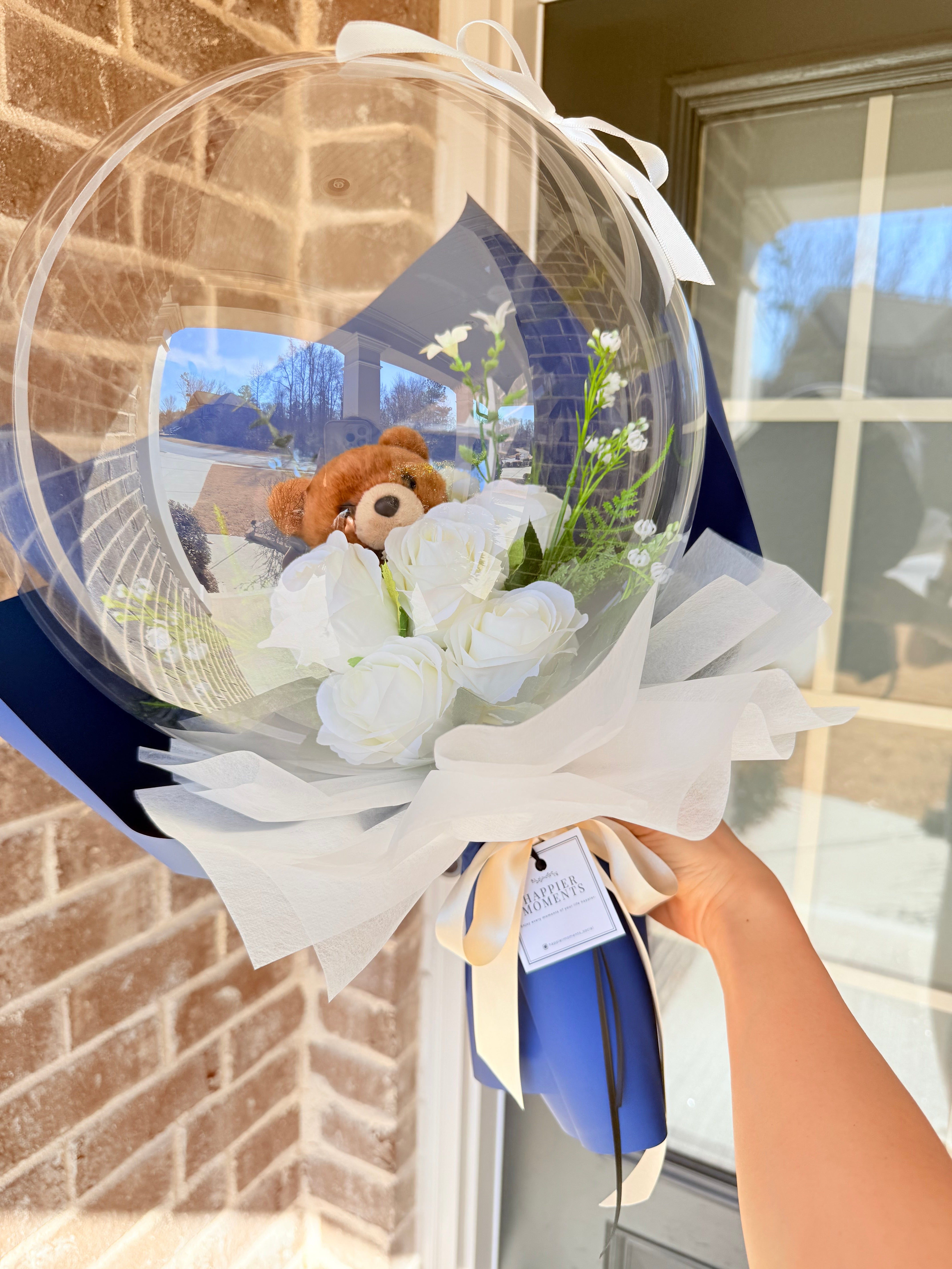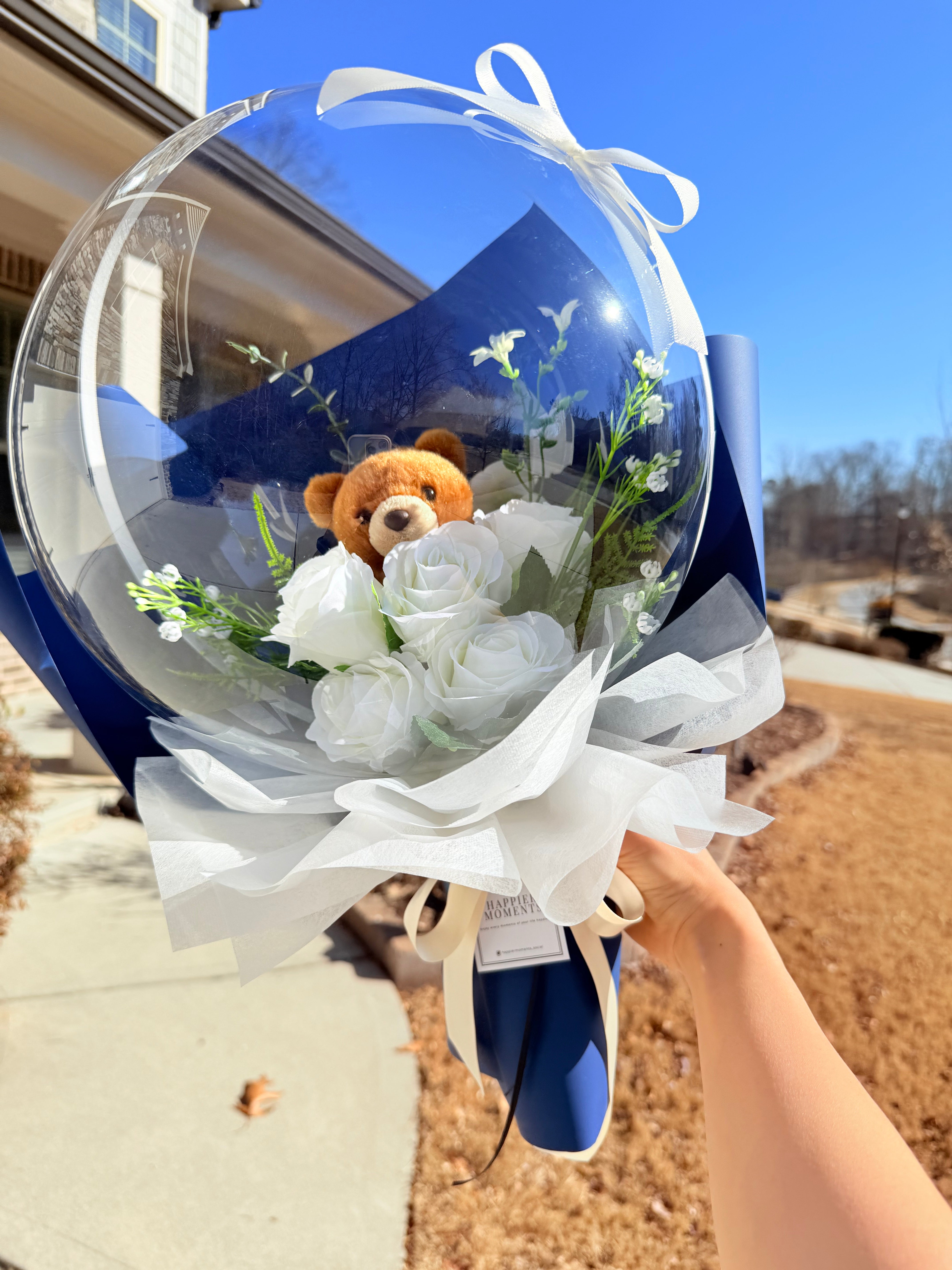 Teddy Bear White Rose Flower Balloon Bouquet Navy Flower Wrapping paper | Birthday Mother's Day Valentine's Anniversary Graduation Gift