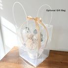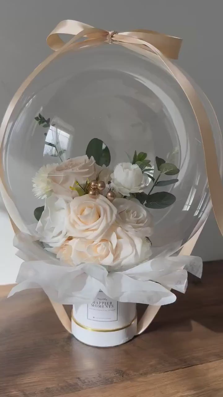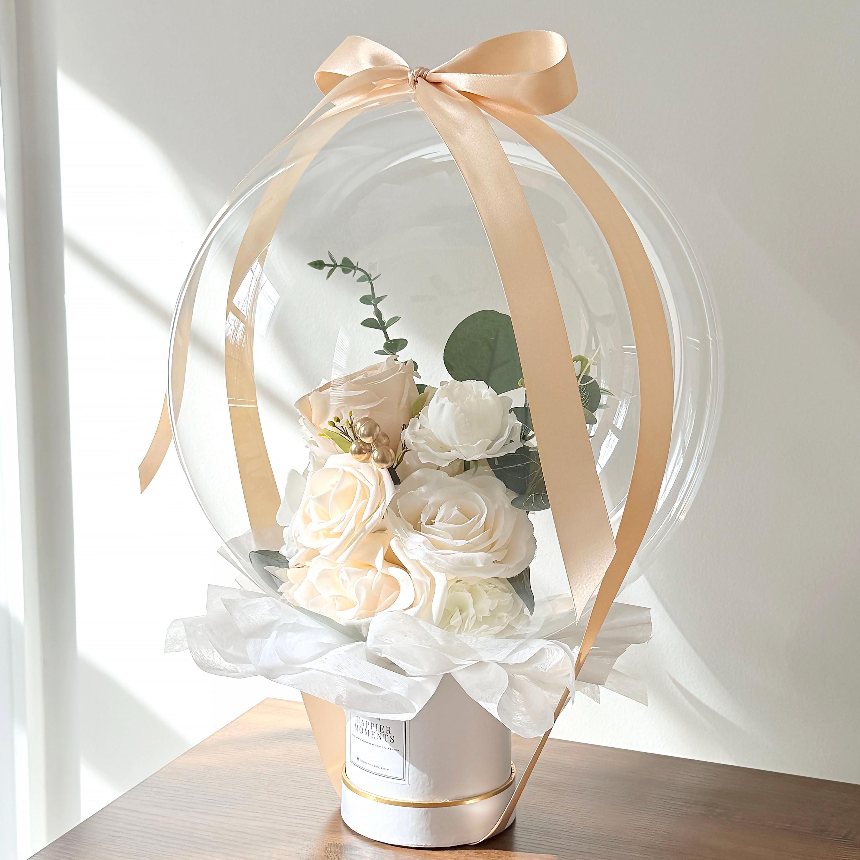 ➼ Artificial Flowers, Clear Balloon, Silky Ribbon, Round Gift Box, Tissue Papers