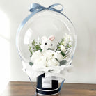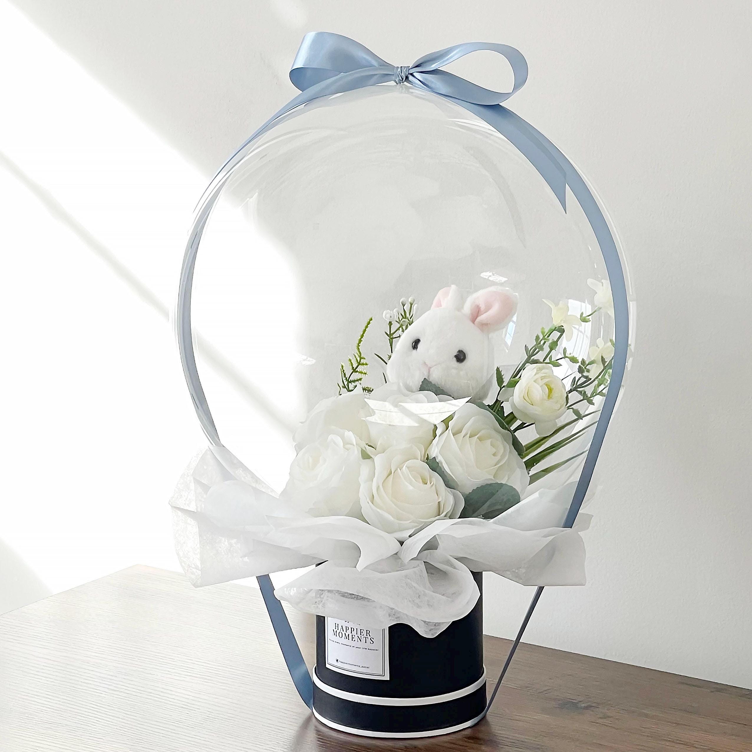 ➼ Bunny Plush, Artificial Flowers, Clear Balloon, Silky Ribbon, Round Gift Box, Tissue Papers