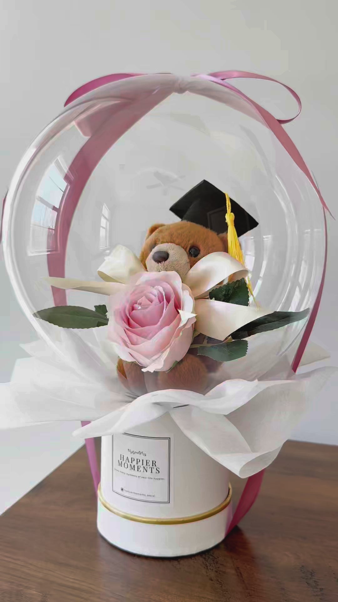 ➼ Graduation Teddy Bear Plush, Artificial Flowers, Clear Balloon, Silky Ribbon, Round Gift Box, Tissue Papers
