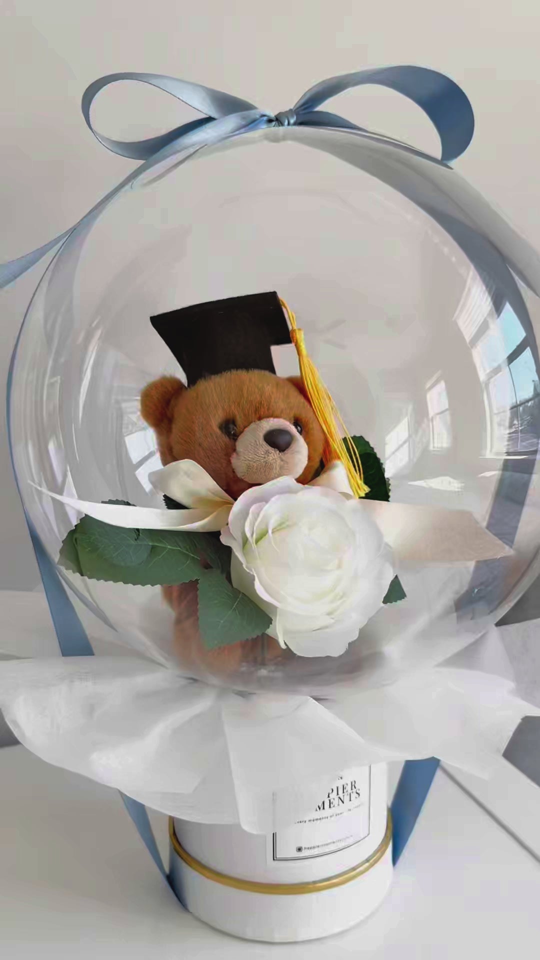 ➼ Graduation Teddy Bear Plush, Artificial Flowers, Clear Balloon, Silky Ribbon, Round Gift Box, Tissue Papers