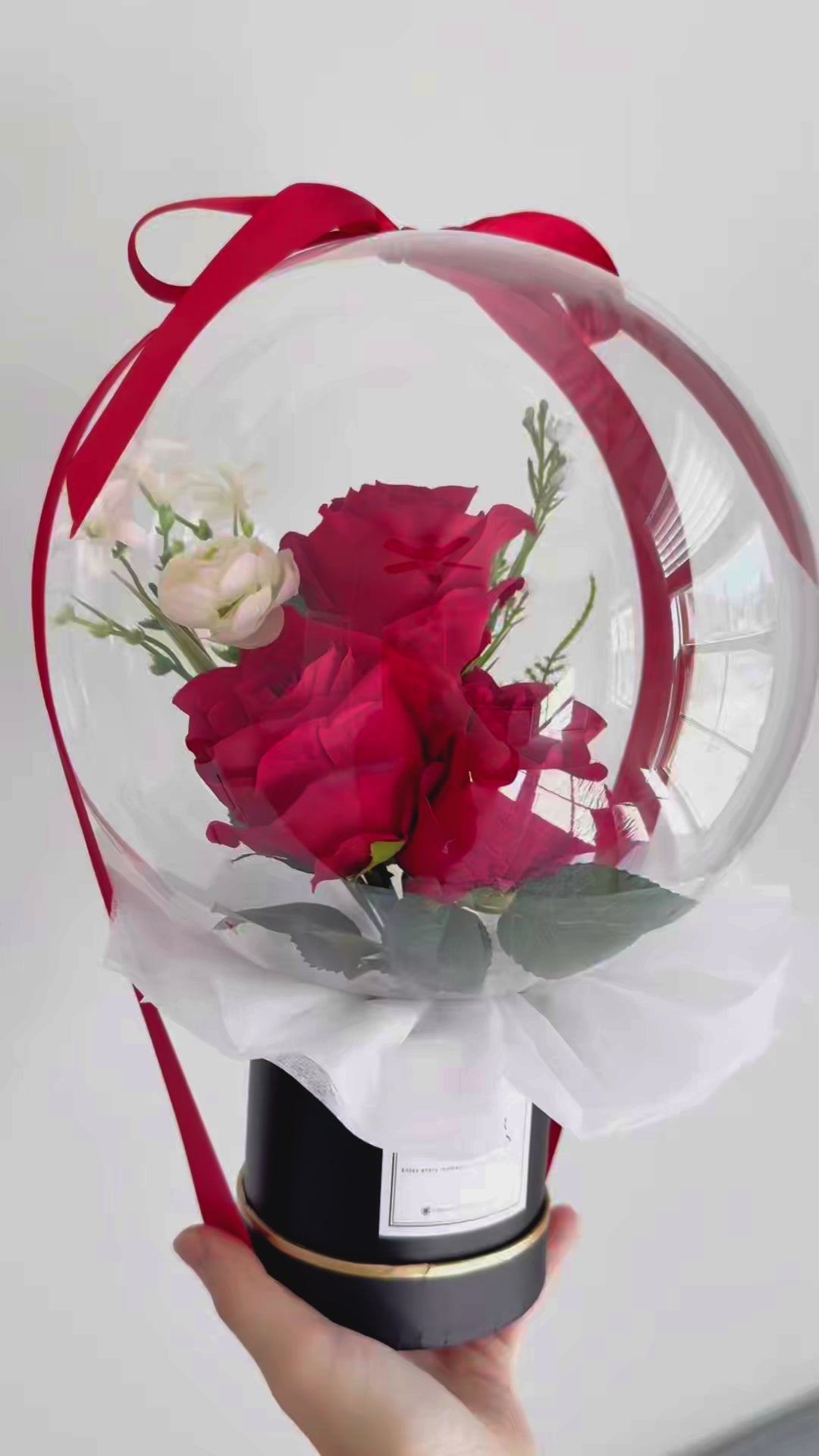 ➼ Artificial Flowers, Clear Balloon, Silky Ribbon, Round Gift Box, Tissue Papers