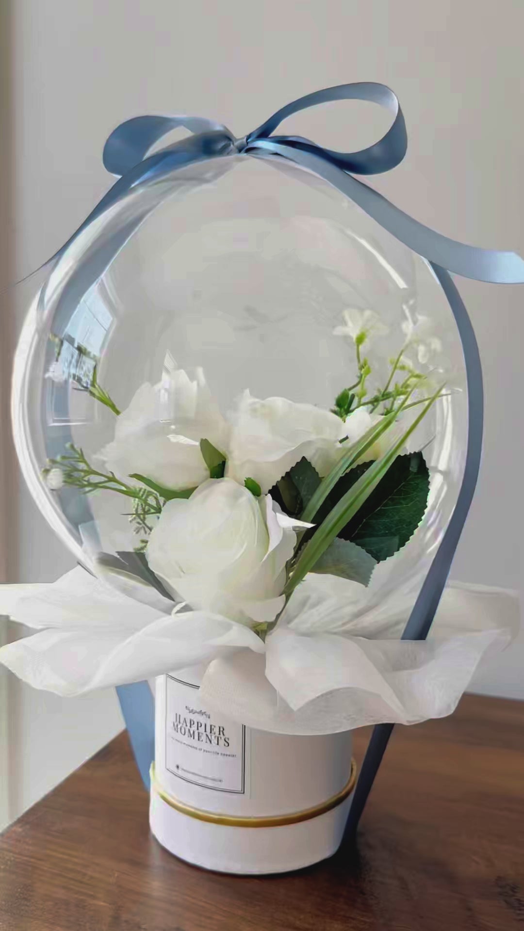 ➼ Artificial Flowers, Clear Balloon, Silky Ribbon, Round Gift Box, Tissue Papers