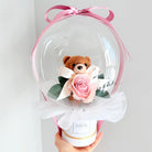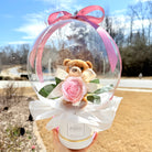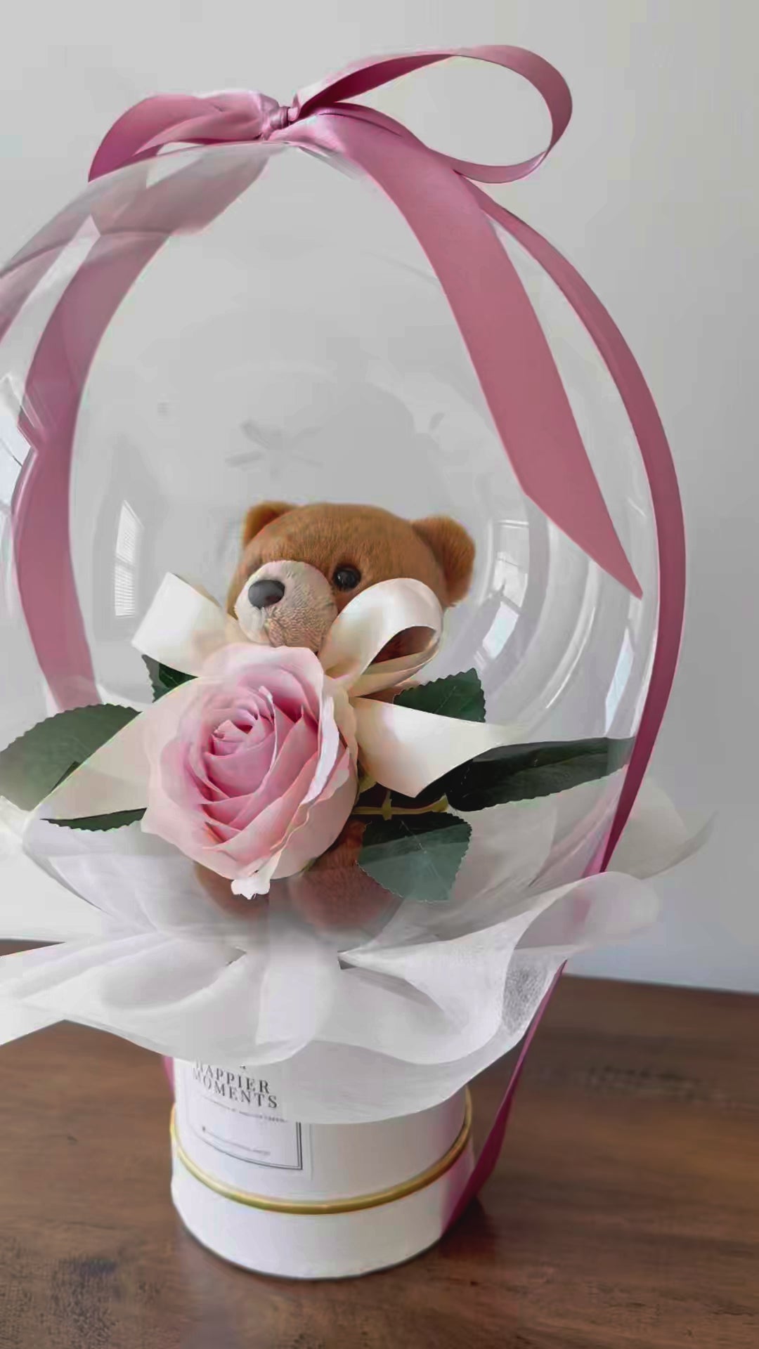 ➼ Teddy Bear Plush, Artificial Flowers, Clear Balloon, Silky Ribbon, Round Gift Box, Tissue Papers