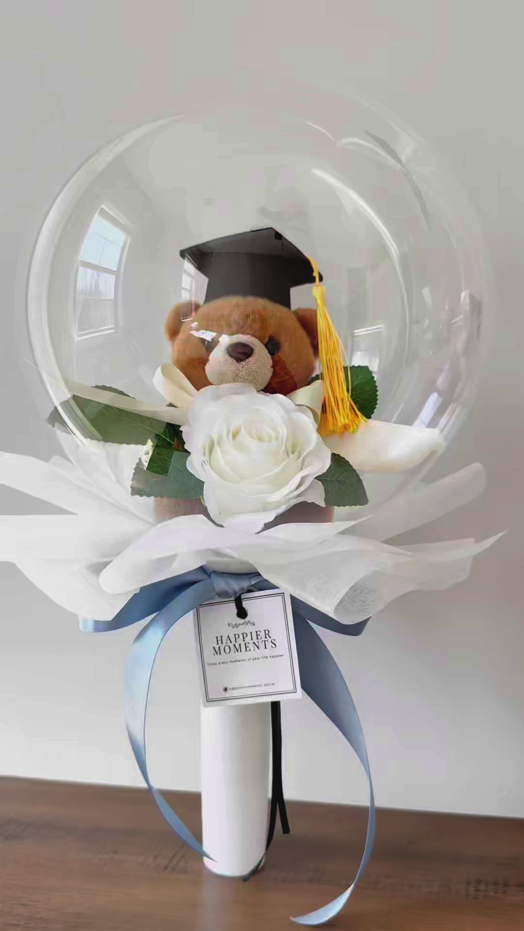 ➼ Graduation Teddy Bear Plush, Artificial Flowers, Clear Balloon, Silky Ribbon, Tissue Papers, Bouquet Handle