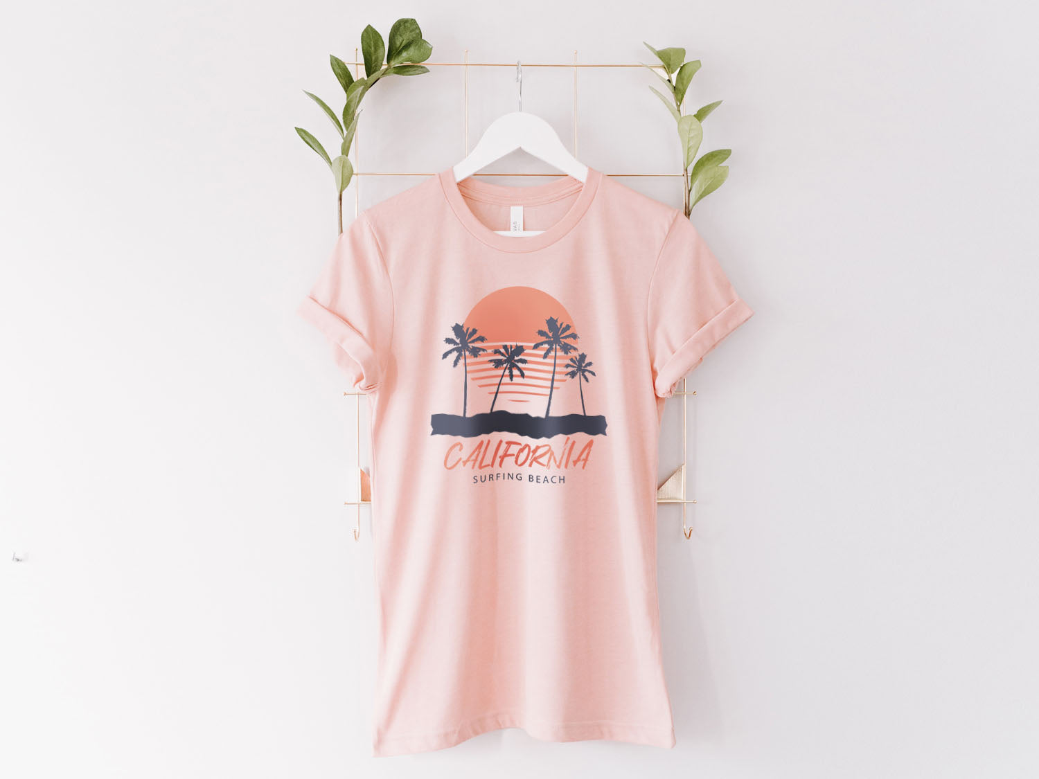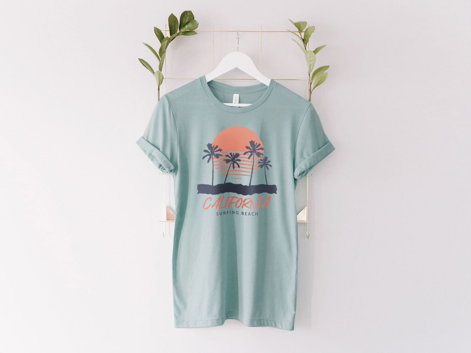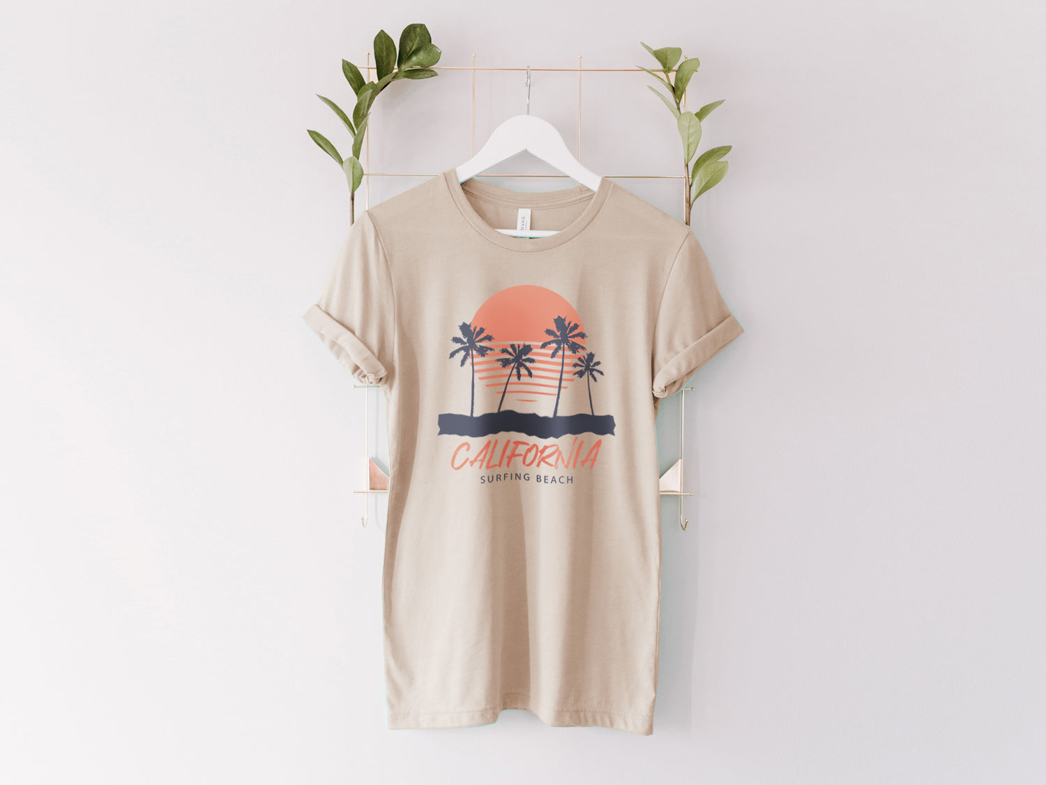 California Palm Tree Sunset Beach Surfing T-shirt - Beach Vibes California State Retro Vintage Design Printed Tee Shirt