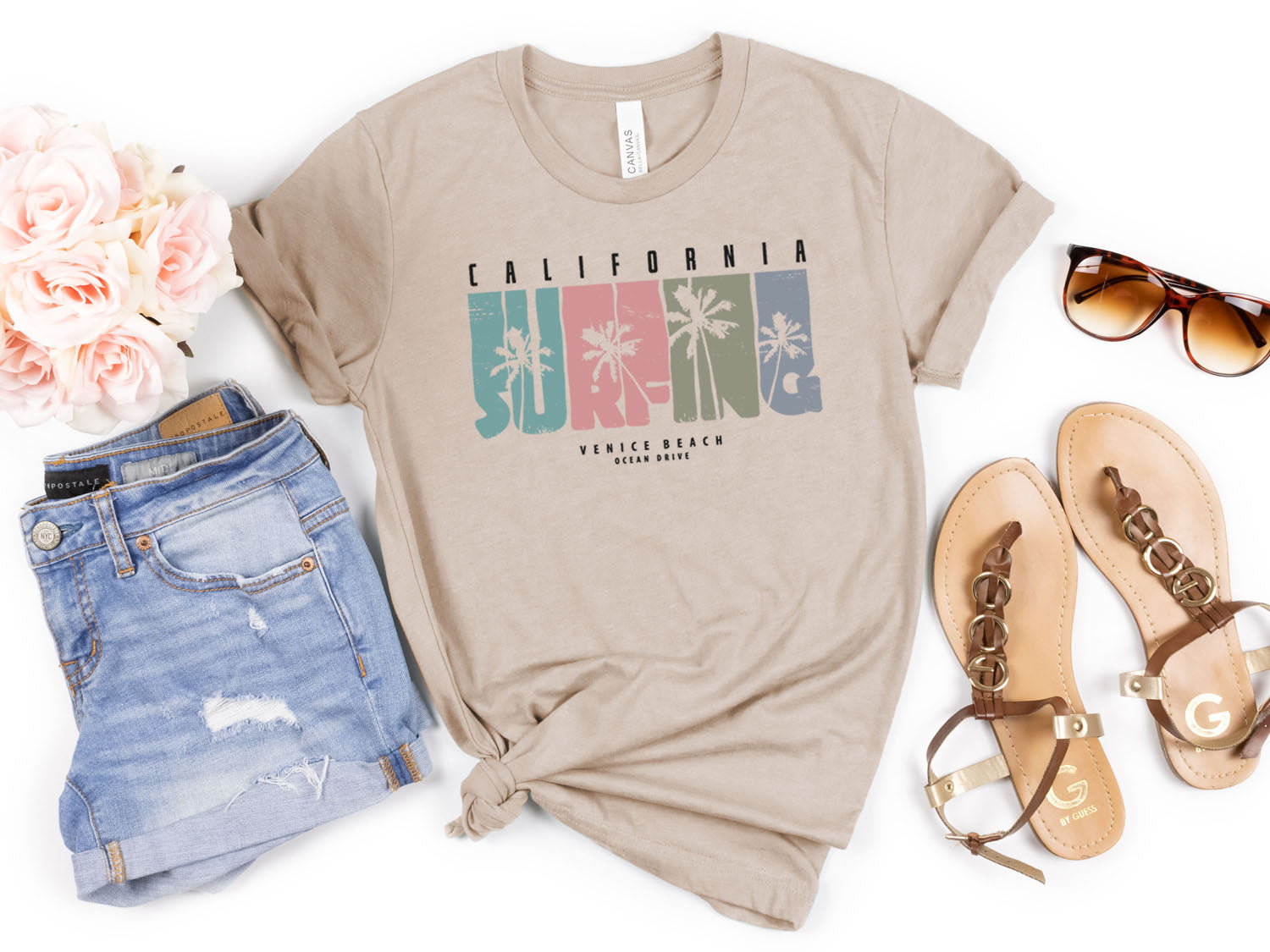 California Palm Tree Venice Beach Surfing T-Shirt - Beach Vibes California State Retro Vintage Design Printed T-Shirt